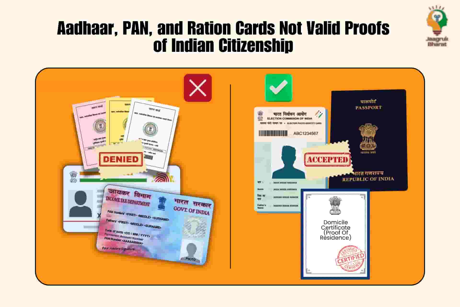 The Indian government has said that Aadhaar, PAN and ration cards are no longer valid documents that prove someone is an Indian citizen. It demonstrates that better checks are needed to stop non-citizens from using these documents improperly. Those without other papers are particularly affected by this change.